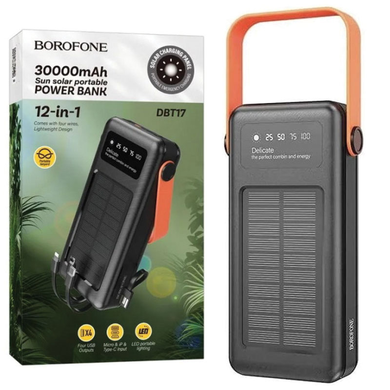 Borofone (DBT17) – Baterie Externa, cu panou solar, 4xUSB-A si cabluri 3 in 1, 30.000mAh, Black