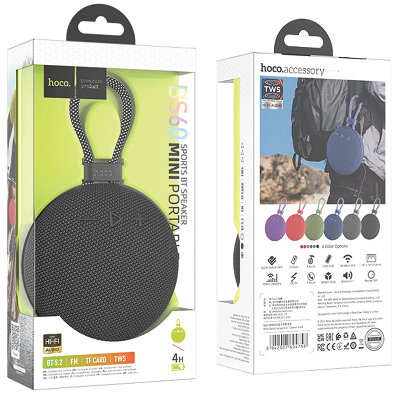 Hoco (BS60) » Boxa Portabila, BT 5.2, Wireless, 1200mAh, 5W, TF Card, USB, TWS, Sports, Black
