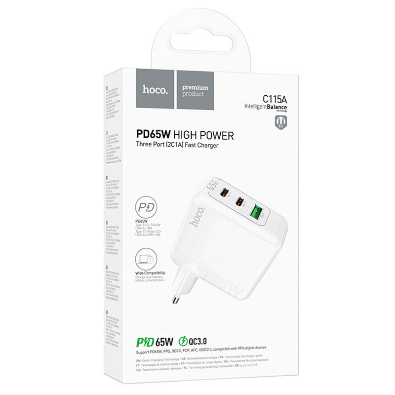 Hoco (C115A) – Incarcator Retea, 65W, 2xUSB-C, 1xUSB-A, PD, QC 3.0, White
