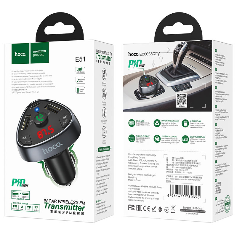 Hoco (E51) – Modulator FM | BT, 18W, 5V, 3.1A, 1xUSB-C, 1xUSB-A, PD, QC 3.0, Black