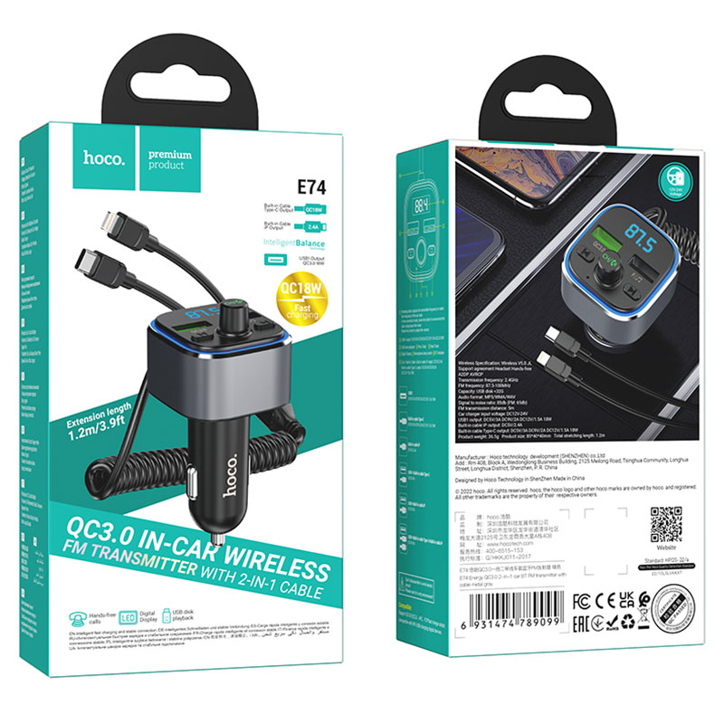 Hoco (E74) – Modulator FM | BT, 18W, 5V, 3A, 2xUSB-A, QC 3.0, + Cablu extensibil 2in1 | Silver