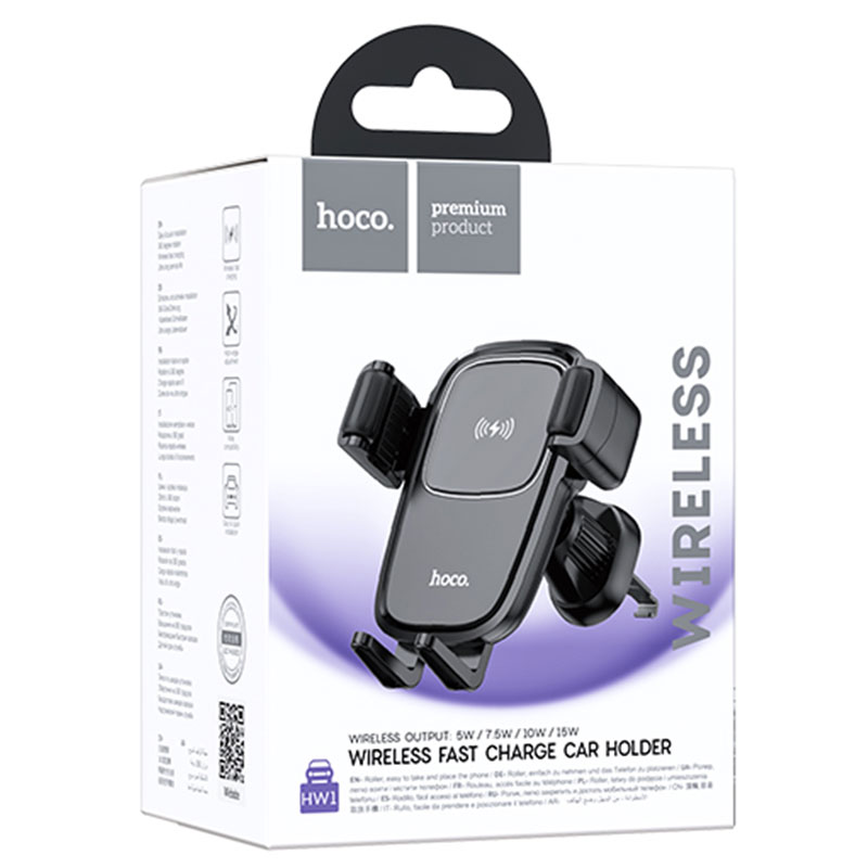 Hoco (HW1) – Suport Auto cu incarcare Wireless, 15, cu cleme laterale, montaj Ventilatie, cablu USB-C, 1m, AutoGravity, Pull Hook, Black