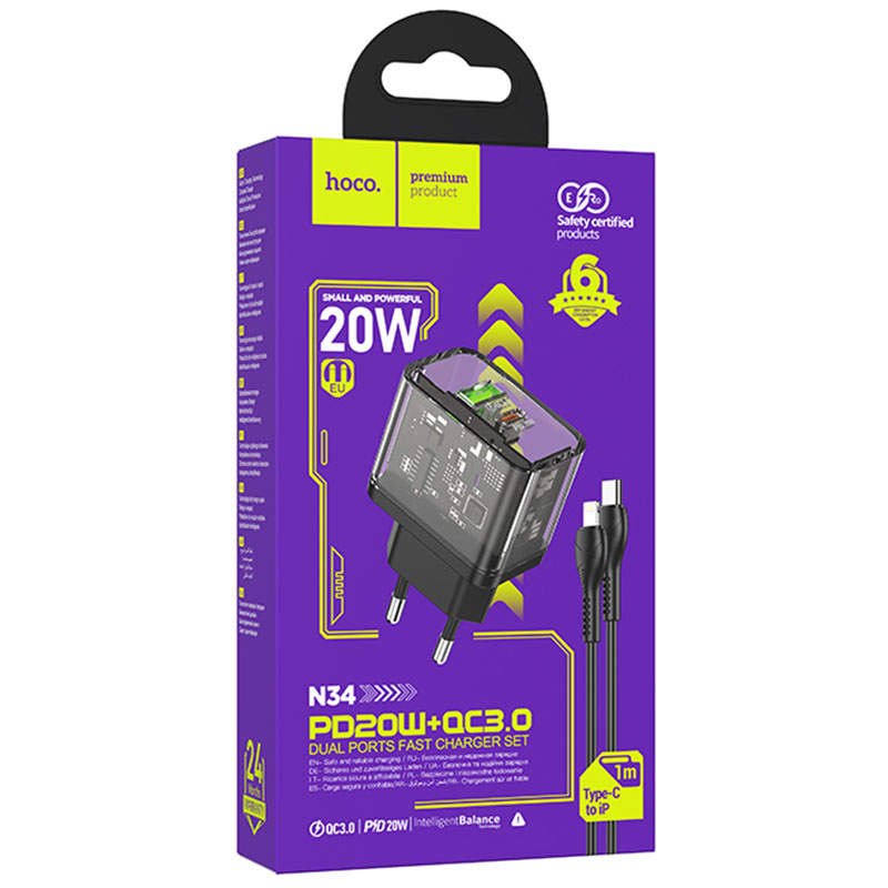 Hoco (N34) – Incarcator Retea + Cablu Lightning, 20W, 1xUSB-C, 1xUSB-A, PD, QC 3.0, Clear, Black