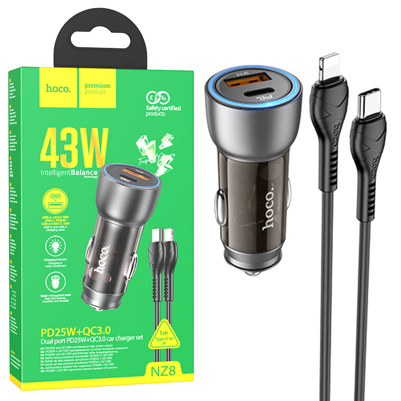 Hoco (NZ8) – Incarcator Auto + Cablu Lightning, 45W, 1xUSB-C, 1xUSB-A, PD, QC 3.0, Clear, BROWN