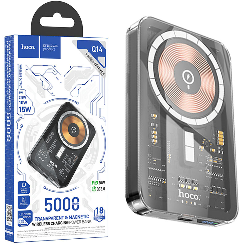 Hoco (Q14) – Baterie Externa Wireless, 1xUSB-C PD, 5V, 2A, Magnet, Display LED, 5.000mAh, Black