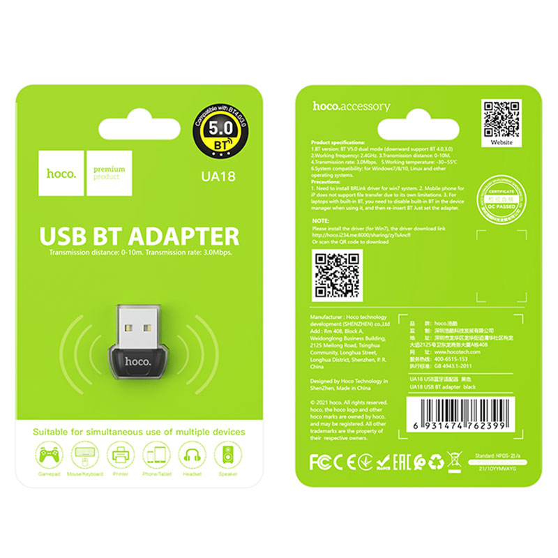 Hoco (UA18) – Adaptor BT, USB-A, BT 5.0, Black