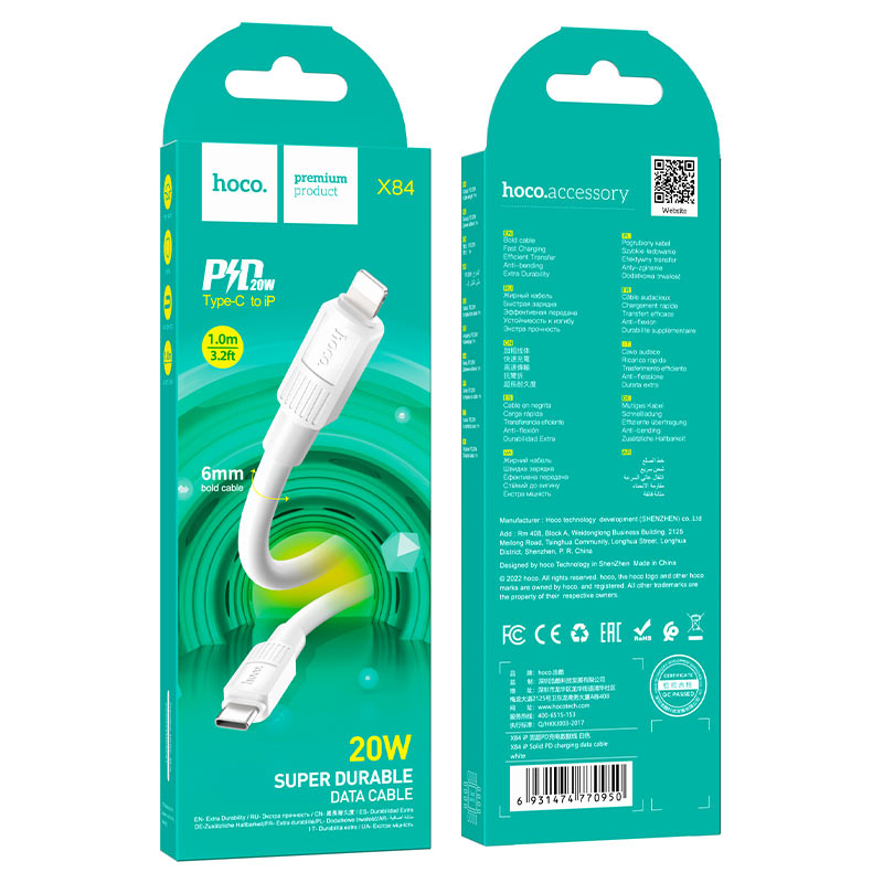 Hoco (X84) – Cablu Date si Incarcare, USB-C la Lightning, PD20W, QC3.0, 1m, White