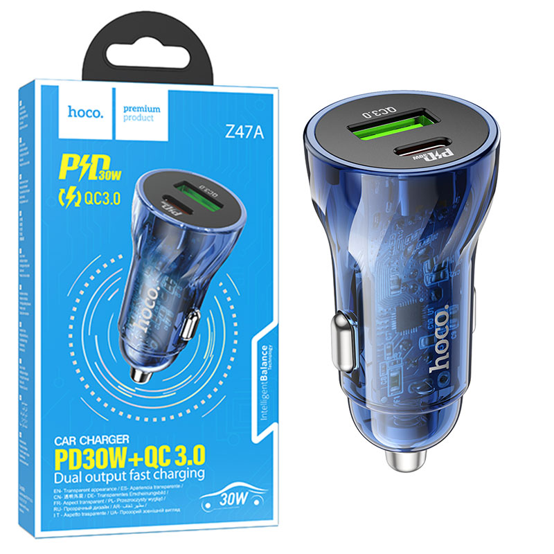 Hoco (Z47A) – Incarcator Auto, 30W, 1xUSB-C, 1xUSB-A, PD, QC 3.0 | Blue