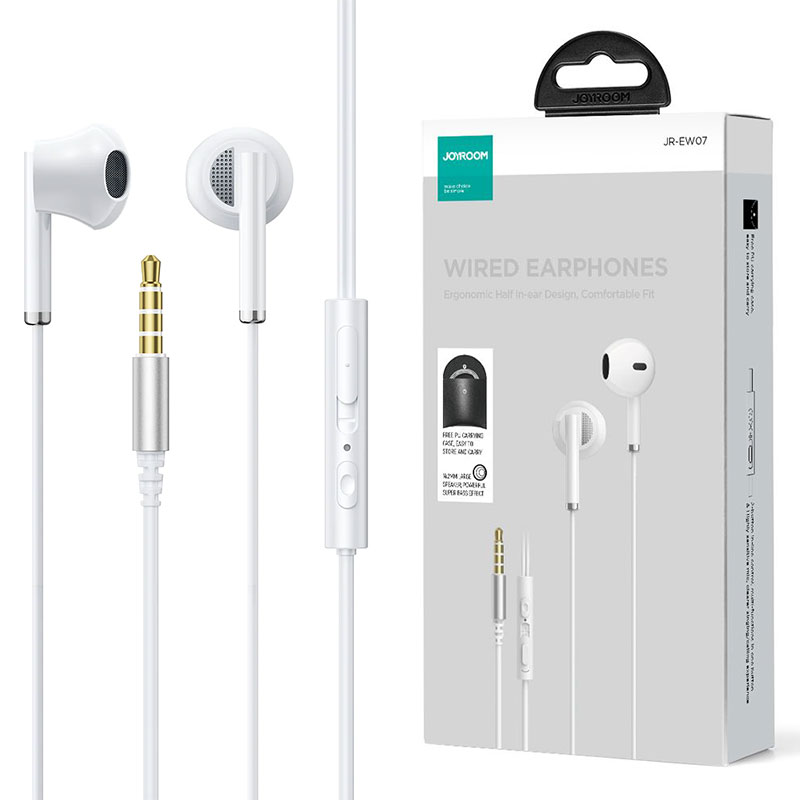 Joyroom (JR-EW07) – Casti cu Fir, In Ear, 3.5mm, 1.2m, Mic & Volume Key, HiFi + Husa | WHITE