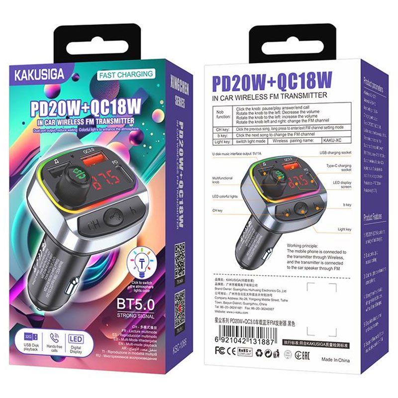 Kaku (KSC-1062) - Modulator FM | BT, 45W, 1xUSB-C, 1xUSB-A, PD, QC 3.0, Functie HandsFree | Silver