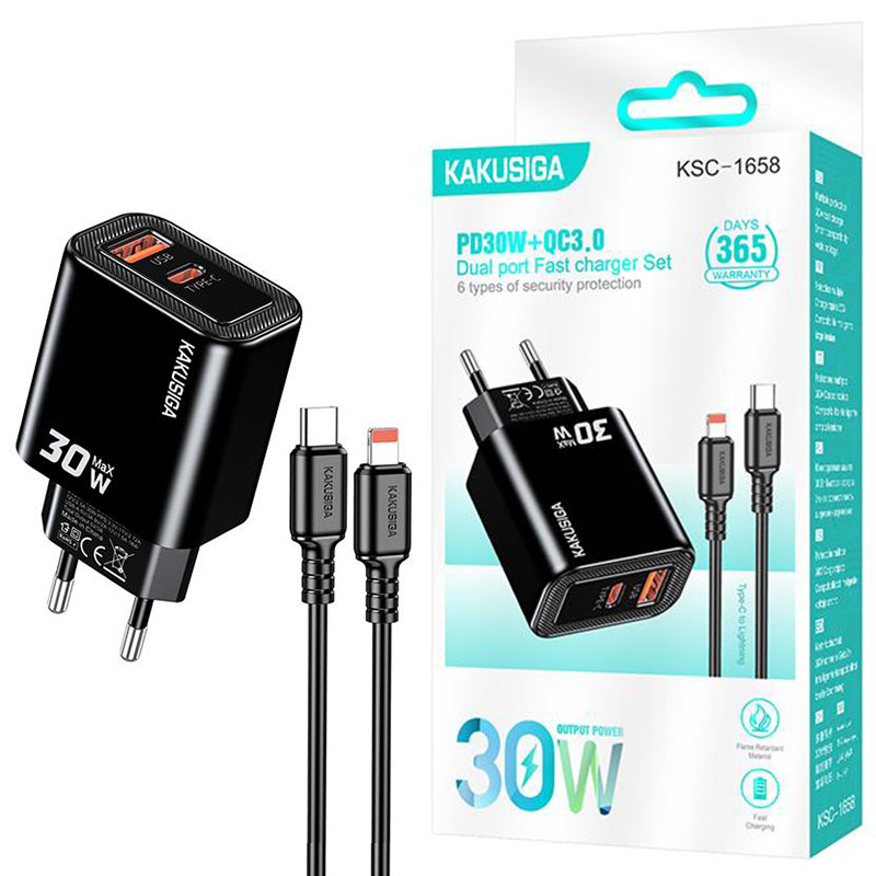 Kakusiga (KSC-1658) » Incarcator Retea + Cablu Lightning, 1m, (PD30W+QC3.0) 5V, 1xUSB, 1xUSB, Fast, WHITE