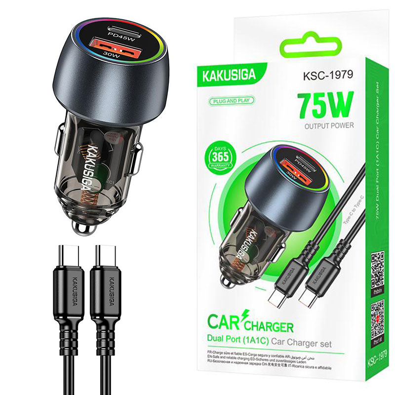 Kakusiga (KSC-1979) » Incarcator Auto + Cablu USB-C, 1m, (PD75W+QC3.0) 5V, 1xUSB, 1xUSB, Fast, Ambient Light, BLACK