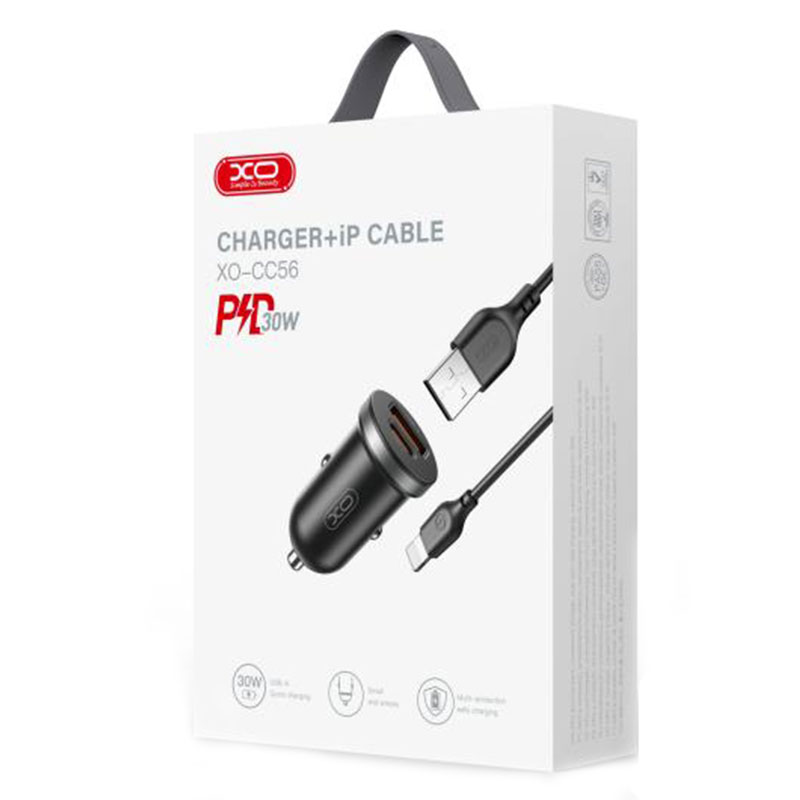 XO (CC56) – Incarcator Auto + Cablu Lightning, 30W, 1xUSB-C, 1xUSB-A, PD, QC 3.0, Compact, Black