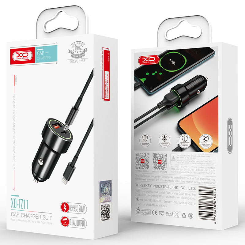 XO (TZ11) – Incarcator Auto + Cablu Lightning, 18W, 1xUSB-C, 1xUSB-A, PD, QC 3.0, Black